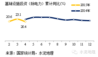累计:2015年1~4月份基础设施投资(除电力)2.03万亿,同比增速为20.40%,继3月份的短暂上调后又回落,与上月增速相比,下降2.7个百分点。