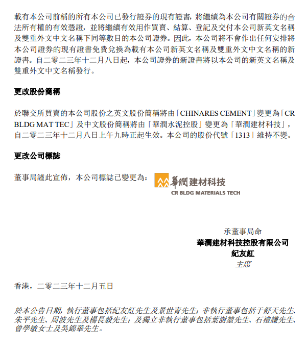 于联交所买卖的本公司股份之英文股份简称将由“CHINARESCEMENT”变更为“CRBLDGMATTEC”及中文股份简称将由“华润水泥控股”变更为“华润建材科技”,自2023年12月8日上午9时起生效。本公司的股份代号「1313」维持不变。