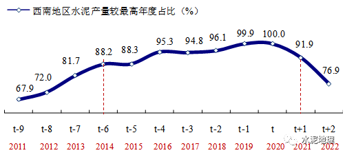 西南是十二五、十三五(2011~2020)期间全国需求最旺市场,市场一路走高,2020年达到峰值,2022年较2020年深跌23.1%,大有紧步东北后尘之势。西南体量较大,水泥产量占到全国总量17%,如此快速下滑,对全局有较大影响。