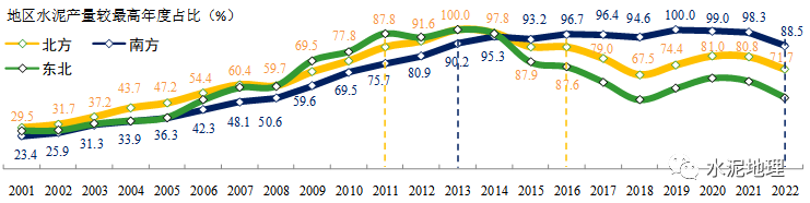 北方地区,2022年水泥产量较最高年度2013年9.5亿吨产量下跌28.3%,先期进入市场下行期。东北下跌幅度最大,49.0%;西北最小24.2%。北方三地,泛华北(含华北、鲁豫地区)、东北、西北先期在2014年前进入市场下行期。