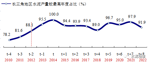 ,(上海、江苏、浙江、安徽)市场高峰期从2012年至今,仍在延续。2014年为峰值。高峰期历时长达11年。2022年水泥产量较上年下降6.0%,大大低于地区全国其他地区,水泥需求仍然保持在高位运行,是全国最好市场,特征非常明显。