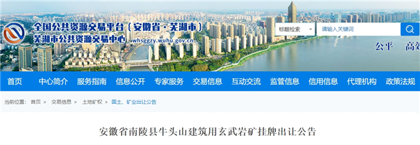 安徽省芜湖市公共资源交易中心发布南陵县牛头山建筑用玄武岩矿挂牌出让公告。该矿资源储量8563.58万吨,开采规模450万吨/年,拟出让年限19年,起始价84752万元。挂牌时间2023年12月12日至2023年12月26日。