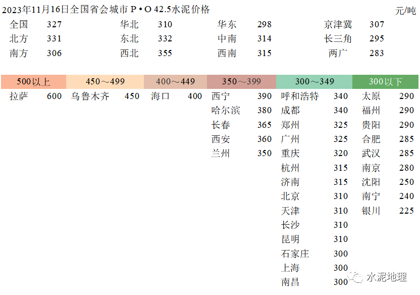 2023年11月16日,全国P • O 42.52020欧洲杯网上投注 价格327元/吨,较上周下跌1元/吨。2022价格高位在11月23日。