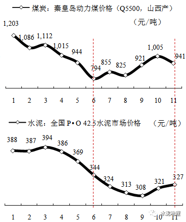 2023年,煤炭、水泥价格较上年呈下降趋势。11月,煤炭价格933元/吨,较上年同期下跌35.2%;水泥价格327元/吨,较上年同期下跌20.1%。