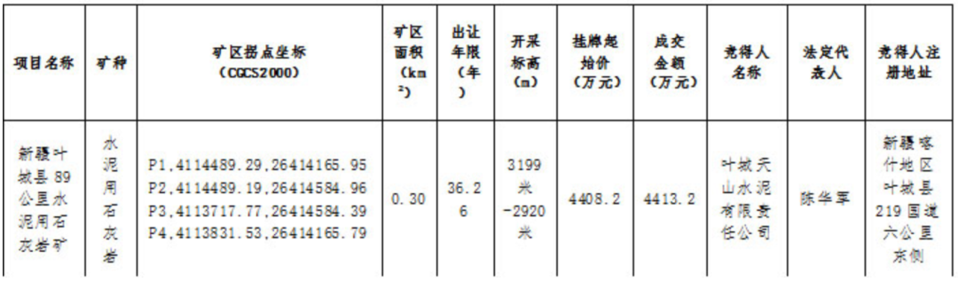 11月13日,喀什地区自然资源局公示新疆叶城县89公里水泥用石灰岩矿采矿权挂牌交易结果,叶城天山水泥有限责任公司以4413.2万元竞得该矿山采矿权。