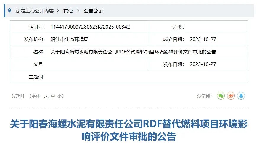 近日,广东省阳江生态环境局发布关于阳春海螺水泥有限责任公司RDF替代燃料项目环境影响评价文件审批的公告。
