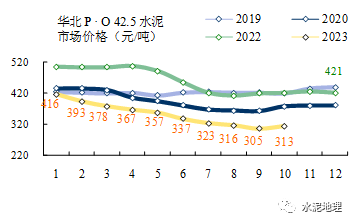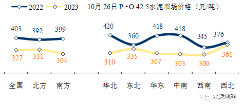 南北方水泥价格在2023年的走势中,南方走出S曲线,价格波动大,3、4月冲高,迅速回落,9月见底。北方价格相对平稳。10月价格在东北大幅拉升下走高。