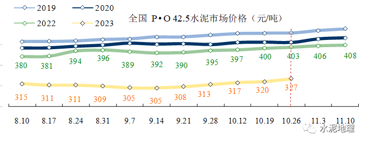10月26日,全国P • O 42.5 水泥价格327元/吨。与2018~2022年同期价格平均价差130元/吨。