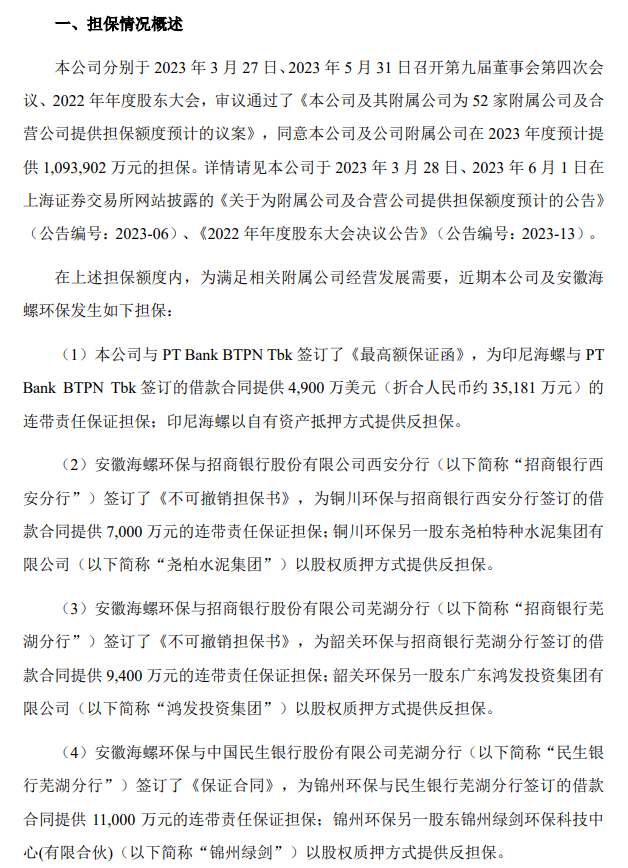 (4)安徽海螺环保与中国民生银行股份有限公司芜湖分行(以下简称“民生银行芜湖分行”) 签订了《保证合同》,为锦州环保与民生银行芜湖分行签订的借款合同提供 11,000 万元的连带责任保证担保:锦州环保另一股东锦州绿剑环保科技中心(有限合伙)(以下简称“锦州绿剑”) 以股权质押方式提供反担保。