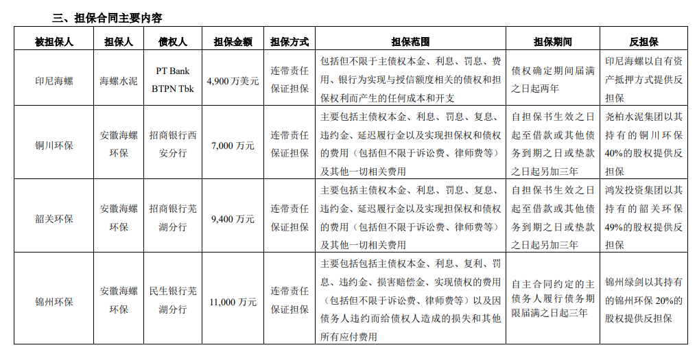 (1)本公司与PT Bank BTPN Tbk 签订了《最高额保证函》,为印尼海螺与PTBank BTPN Tbk 签订的借款合同提供 4,900 万美元(折合人民币约 35,181 万元)的连带责任保证担保:印尼海螺以自有资产抵押方式提供反担保。