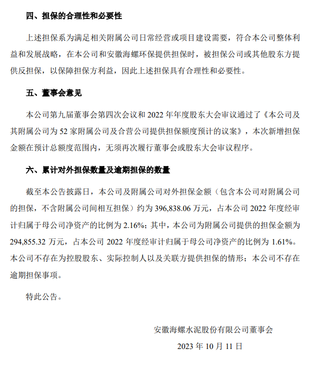 海螺水泥:为附属公司提供担保金额约6.3亿元!
