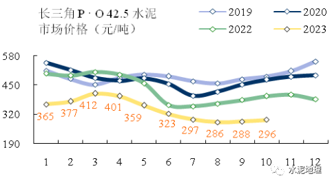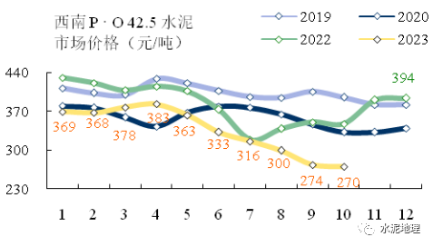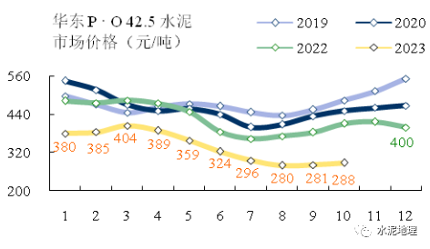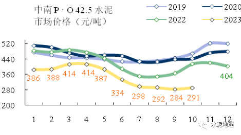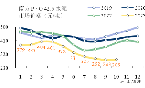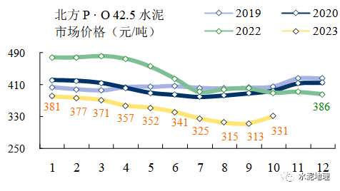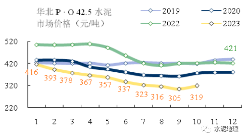 南北方水泥价格在2023年的走势中,南方走出S曲线,价格波动大,3、4月冲高,迅速回落,9月见底。北方价格相对平稳。10月价格在东北大幅拉升下走高,能否稳住,有待观察。