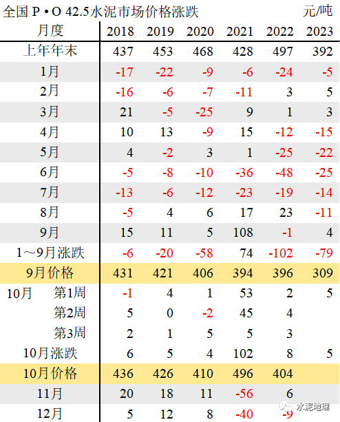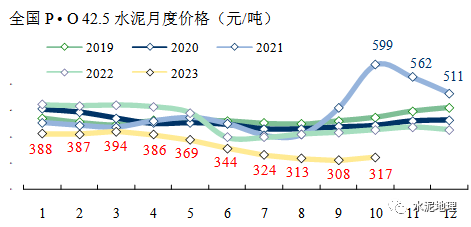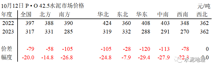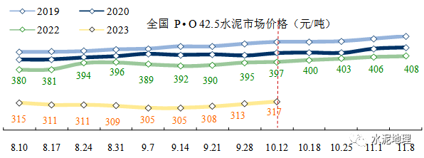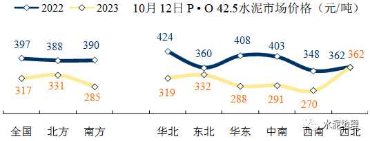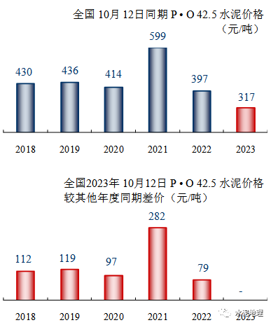 10月12日,全国P • O 42.5 水泥价格317元/吨。与2018~2022年同期价格平均价差138元/吨。