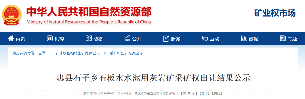 按照《探矿权采矿权招标拍卖挂牌管理办法(试行)》《矿业权交易规则》及有关法律法规的规定,现将忠县石子乡石板水水泥用灰岩矿采矿权(公告序号:ZXGC202301)成交结果公示如下: