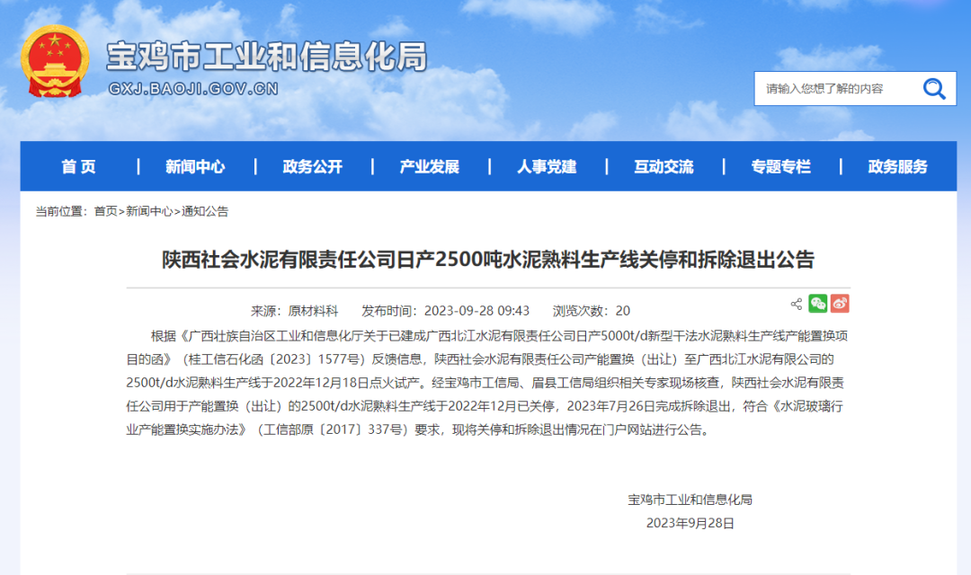 近日,陕西宝鸡市工信局发布陕西社会水泥有限责任公司日产2500吨水泥熟料生产线关停和拆除退出公告。