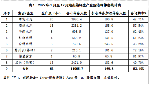 ,窑运转率53.49%;与2021年(62条算术平均每条窑停111.5天)同比增加64.1天。根据错峰停窑天数推算,2022年湖南水泥熟料产量约0.58亿吨,同比下降21.2 %,熟料产能利用率由2021年的67.5%进一步降低至54.8%。