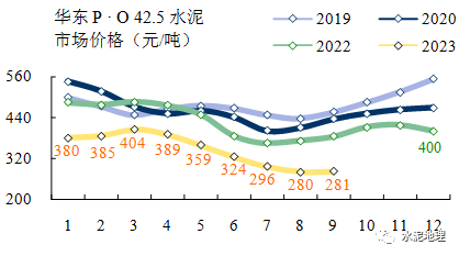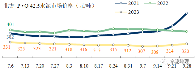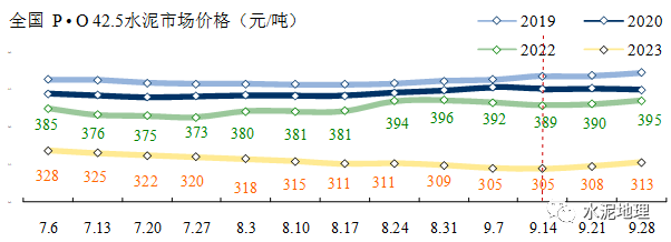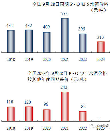 9月28日,全国P • O 42.5 水泥价格313元/吨。与2018~2022年同期价格平均价差132元/吨。(2021年同期价格大幅拉升)