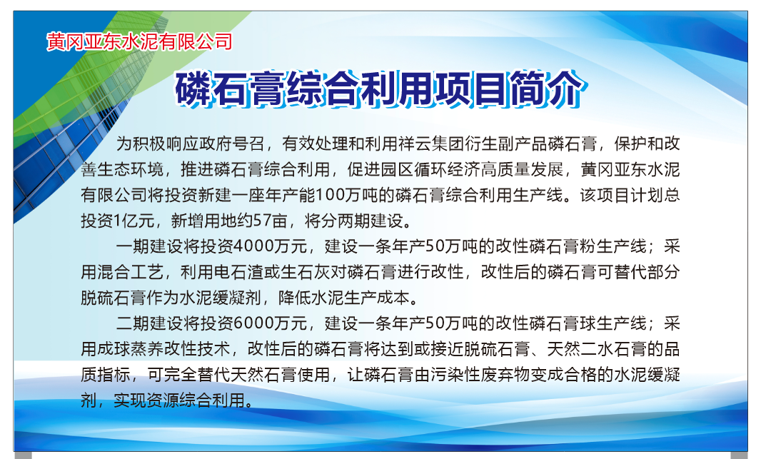 项目总投资1亿,占地约57亩,建设2条改性磷石膏生产线,年处理磷石膏100万吨。