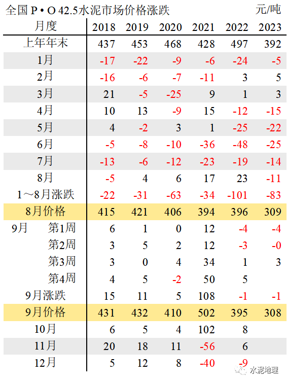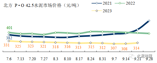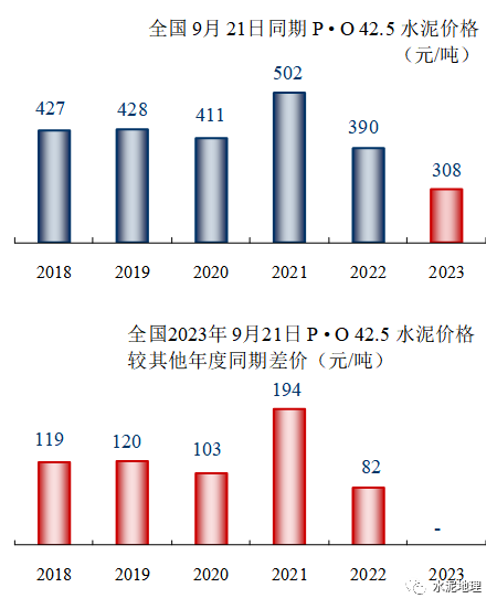 9月21日,全国P • O 42.5 水泥价格308元/吨。与2018~2022年同期价格平均价差124元/吨。(2021年同期价格大幅拉升)