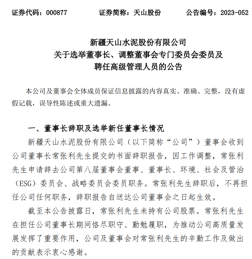 天山股份于8月23日晚间发布《关于选举董事长、调整董事会专门委员会委员及聘任高级管理人员的公告》,公告称: