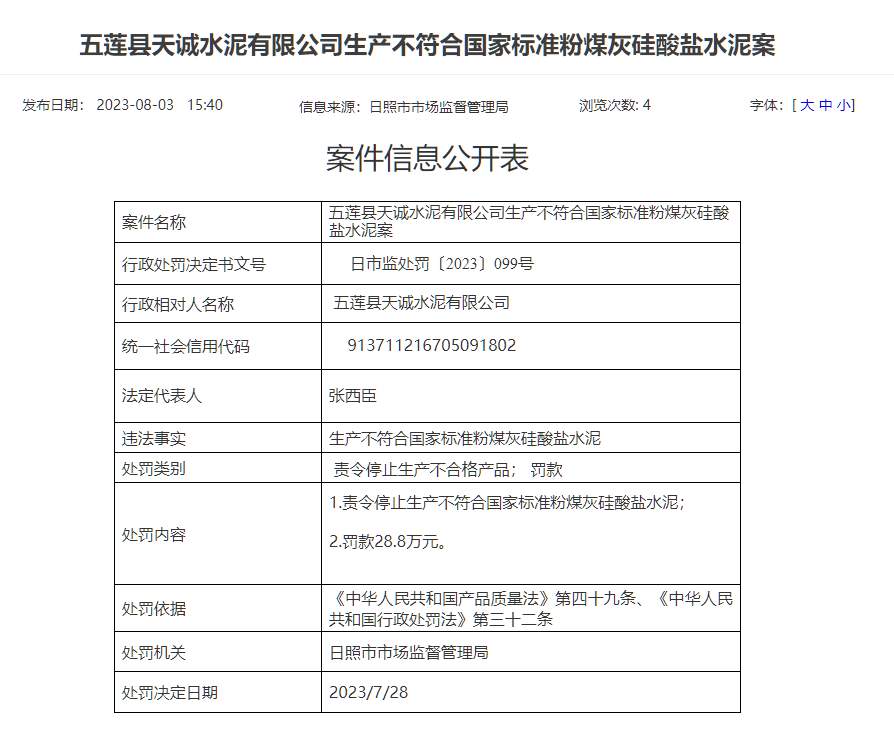案件信息公开表显示,五莲县天诚水泥有限公司生产不符合国家标准粉煤灰硅酸盐水泥。依据《中华人民共和国产品质量法》第四十九条、《中华人民共和国行政处罚法》第三十二条,日照市市场监管局责令企业停止生产不符合国家标准粉煤灰硅酸盐水泥;并处以28.8万元罚款。