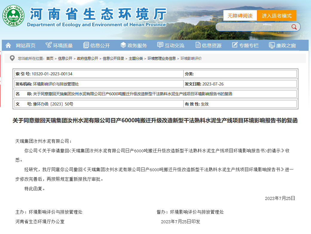 7月25日,河南省生态环境厅发布“关于同意撤回天瑞集团汝州水泥有限公司日产6000吨搬迁升级改造新型干法熟料水泥生产线项目环境影响报告书的复函”。