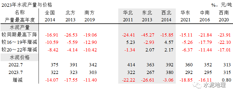 2023年水泥价格大幅下滑,7月P•O 42.5价格322元/吨,较去年同期大幅下滑14.07%,但区域反差很大。