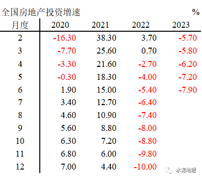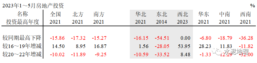 2023年5月,全国房地产投资较2020~2022年同期平均投资下降10.2%。东北、西南下降 30%以上,华北、中南下降10%以上,华东持平,西北增长8.48%。
