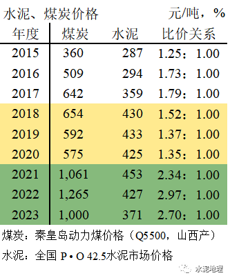 煤炭是水泥制造主要成本,根据煤价的高低,和水泥形成一定的比价关系。2018~2020年,水泥价格高企,煤价走低,煤炭、水泥比价关系在1.40:1.00左右,此间是行业效益最好的时期。2021~2022年,煤炭价格突破1,000元/吨,水泥价格维持在前期水平。煤炭、水泥比价关系突破量了2.00:1.00,2022年接近了3.00:1.00。2023年煤炭、水泥比价关系继续维持在高位2.70:1.00,但水泥价格大幅走低,7月P • O 42.5 水泥价格滑落到325元/吨,很多地区已经跌落到成本价,甚至亏损。