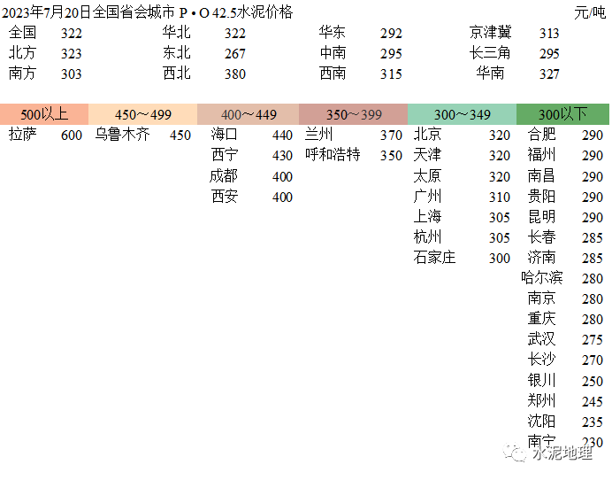 2023年20日,全国水泥价格322元/吨,南方(未含西藏)303元/吨,北方323元/吨,都有一定幅度下降,南方逼近 300元/吨。