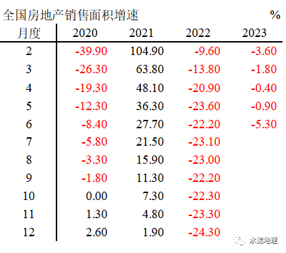 房地产销售是市场晴雨表,水泥需求前导信息。2023年房地产销售承接2022年走势继续在下探中,但幅度缩小。