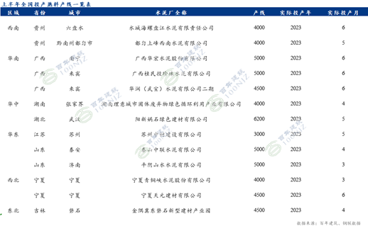 据百年建筑统计,2023年上半年全国实际投产水泥熟料产线13条,较去年同期增加44.4%。主要分布在华东、华南地区,合计熟料产能1878万吨,较同期增加14.3%。