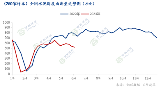 据百年建筑调研全国250家水泥生产企业数据显示:上半年全国水泥出库量为1.4亿吨,同比下降17.5%。新开工不足限制需求高度,因此4月中旬起需求增速未能延续3月的强劲回升势头,4-5月表现出旺季不旺。6月需求在季节性因素影响下转弱。基建需求继续托底。自5月下旬起,由于部分重点工程阶段性竣工,加之局部地区高温多雨影响,基建需求量略有下降,但仍处于上半年高位水平。
