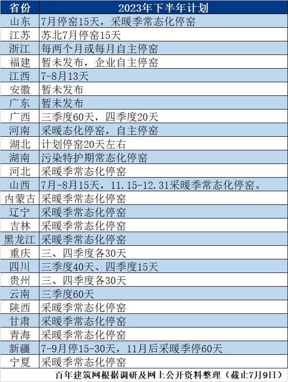 目前多地尚未明确发布下半年错峰生产计划,11月以后北方及南方部分地区执行采暖季常态划错峰生产,整体和去年相同。7-11月从目前看,西南、华南执行错峰生产,供应下降;华东部分地区7-8月高温季停窑,其他地区尚未发布相关停窑通知。总体来看,下半年整体供应呈现“降升降”的走势,但整个降幅、增幅则看需求情况如何,如需求无明显回暖,企业继续自主停窑,供应或将持续低位。