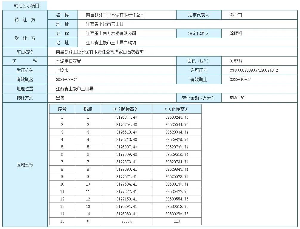 江西一水泥企业转让矿山!玉山南方5830.5万元获得