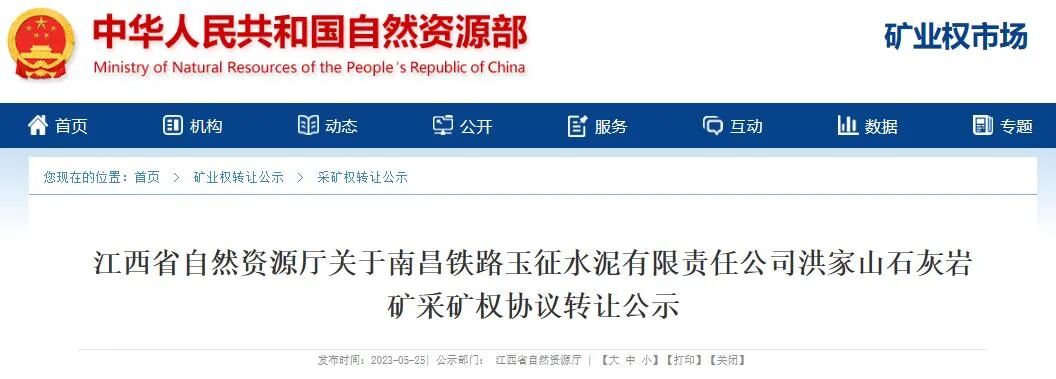 5月25日,江西省自然资源厅发布关于南昌铁路玉征水泥有限责任公司洪家山石灰岩矿采矿权协议转让公示。