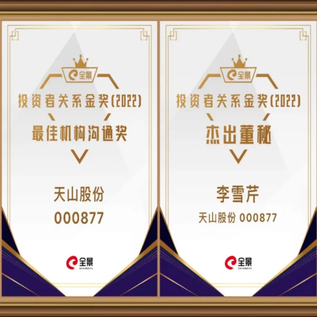 5月23日,由深圳市全景网络有限公司主办、南开大学中国公司治理研究院参与推出的“全景投资者关系金奖”2022年度全国性评选,经过专家顾问组最后环节的评审,获奖榜单正式揭晓,新疆天山水泥股份有限公司(以下简称“新天山水泥”、“公司”)凭借在投资者关系工作中的优异表现,荣获“最佳机构沟通奖”,公司董事会秘书、总法律顾问李雪芹女士荣获“杰出董秘”。一并斩获两项重磅奖项,充分体现了权威媒体和专业研究机构对公司投资者关系工作的高度认可和肯定,也是公司投资者关系管理水平不断提升的见证。