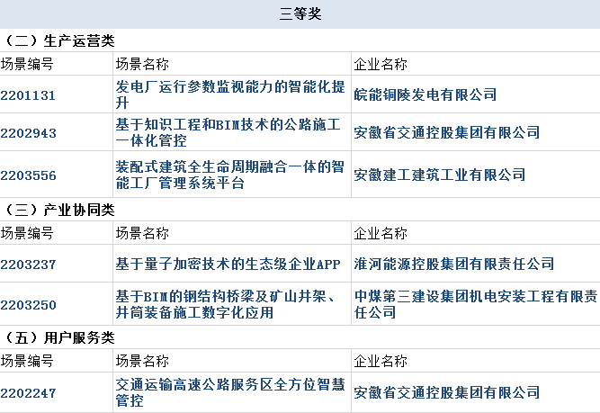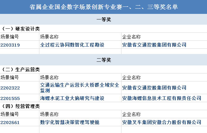 此次比赛中,安徽省属企业共有1个应用场景获得一等奖,3个应用场景获得二等奖,6个应用场景获得三等奖。