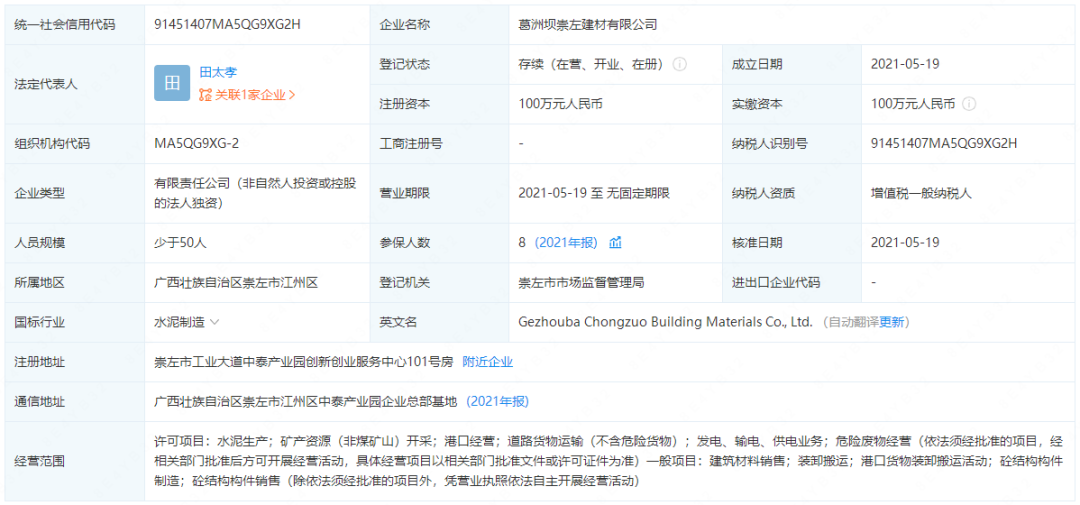 企查查显示,葛洲坝崇左建材有限公司成立于2021年5月19日,注册资本100万元,经营范围为水泥生产、矿产资源(非煤矿山)开采等。由中国葛洲坝集团水泥有限公司100&控股。