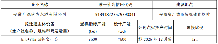 南方水泥有限公司拟淘汰独山南方位于新杭镇牛头山村的两条日产2500吨水泥熟料生产线(窑径均为4.0*60M)、新杭南方位于新杭镇箭穿村一条日产2500吨水泥熟料生产线(窑径为4.0*60M),以广德南方为建设主体在新杭镇青岭村迁建一条日产7500吨水泥熟料生产线(窑径为5.5*84m)。