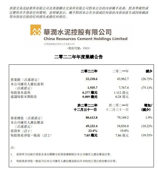 华润水泥控股:2022年度净利润同比减少75.1%至19.36亿港元