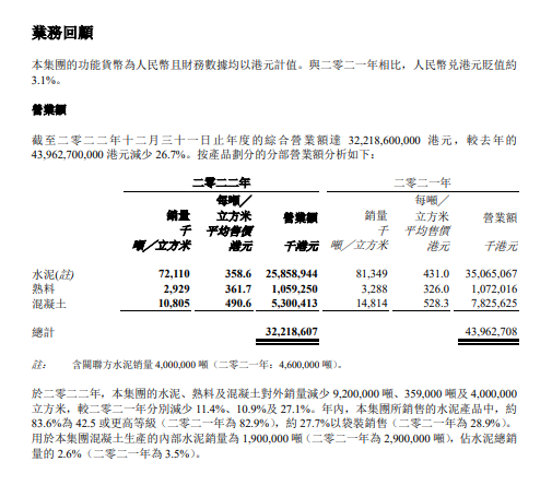 于2022年,水泥、熟料及混凝土的平均售价分别为每吨 358.6 港元、每吨 361.7 港元及每立方米 490.6 港元,较2021年分别减少 16.8%、增加 11.0%及减少 7.1%。
