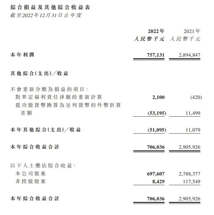 归属于公司权益持有人的利润约为7.49亿元,较2021年度减少73.0%