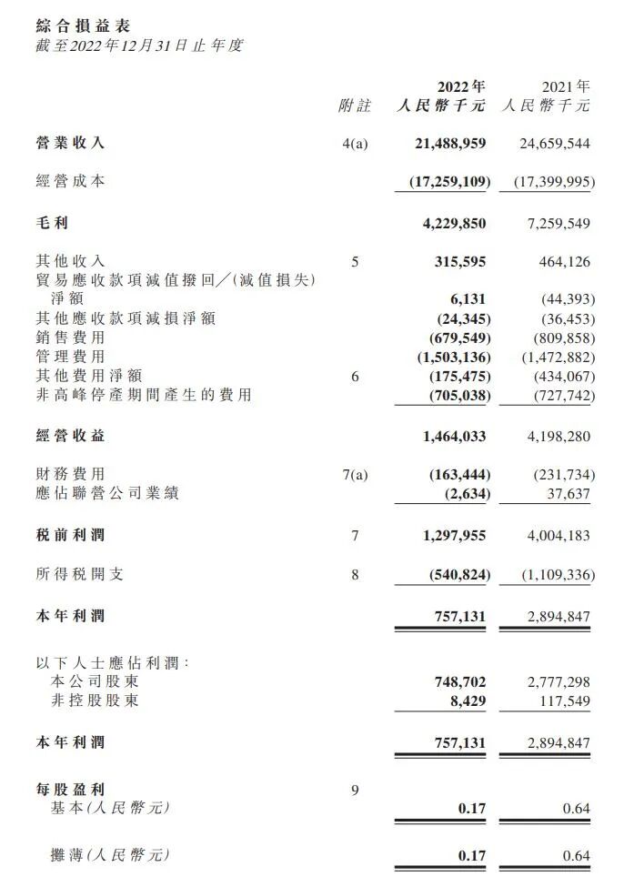 本集团之销售成本主要包括原材料成本、燃料开支(包括煤炭及电力)、折旧及摊销及其他经常性成本。于报告期内,本集团之销售成本为人民币17,259,109,000元(2021年:人民币17,399,995,000元)。销售成本减少主要由于本年度水泥熟料销量减少所致。2022年度之毛利为人民币4,229,850,000元(2021年:人 民 币7,259,549,000元),毛利率为收益之19.7%(2021年:29.4%)。毛利减少,主要由于2022年度水泥熟料销量同比减少;此外,本年度售价与去年度相较持平未上涨,惟原材料成本及煤炭成本大幅上涨,压缩获利空间,致毛利率下滑。
