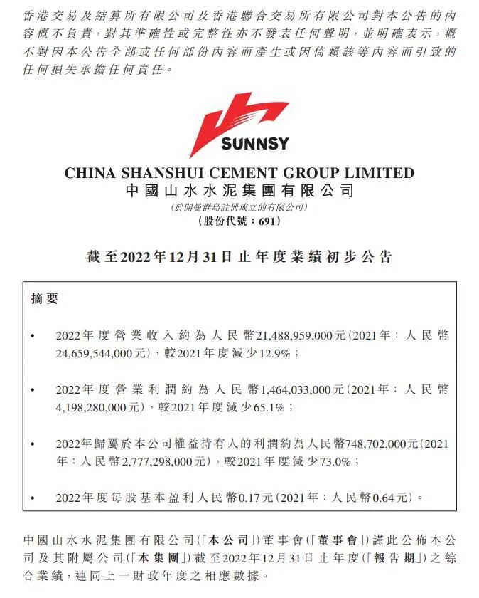 3月15日,山水水泥发布2022年度业绩公告,2022年集团营业收入约为人民币214.89亿元,较2021年度减少12.9%;营业利润约为14.64亿元,较2021年度减少65.1%;