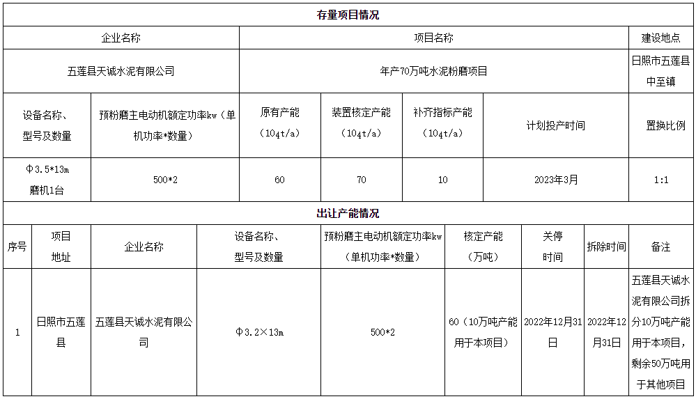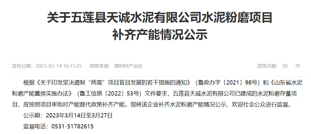 同日发布《关于五莲县天诚水泥有限公司水泥粉磨项目补齐产能情况公示》称,五莲县天诚水泥有限公司已建成的水泥粉磨存量项目,应按照项目审批时产能替代政策补齐产能。