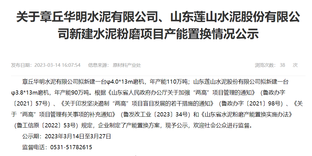 日前,山东工信厅发布《关于章丘华明水泥有限公司、山东莲山水泥股份有限公司新建水泥粉磨项目产能置换情况公示》。公示内容提到,章丘华明水泥有限公司拟新建一台φ4.0*13m磨机,年产能110万吨;山东莲山水泥股份有限公司拟新建一台φ3.8*13m磨机,年产能90万吨。