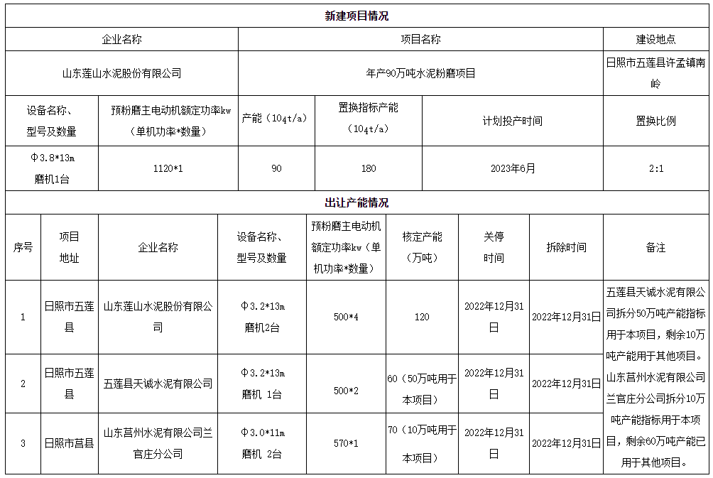 章丘华明水泥有限公司年产110万吨水泥粉磨项目计划投产时间2024年4月;山东莲山水泥股份有限公司年产90万吨水泥粉磨项目计划投产时间2023年6月。两个项目置换比例均为2:1,共淘汰退出粉磨产能400万吨/年。