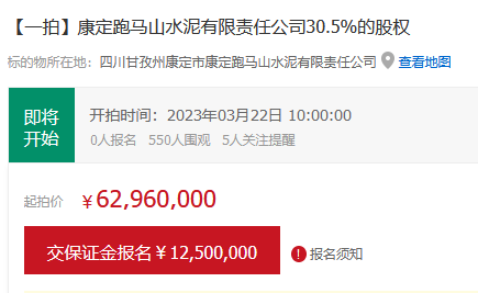 日前,某司法拍卖平台发布康定跑马山水泥股权即将拍卖的信息,如下: