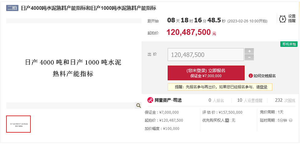 日,某法拍平台显示,河南省平顶山市中级人民法院第二次公开拍卖大连金山水泥制造有限公司名下的日产4000吨水泥熟料产能指标和日产1000吨水泥熟料产能指标,起拍价为1.2048亿元。